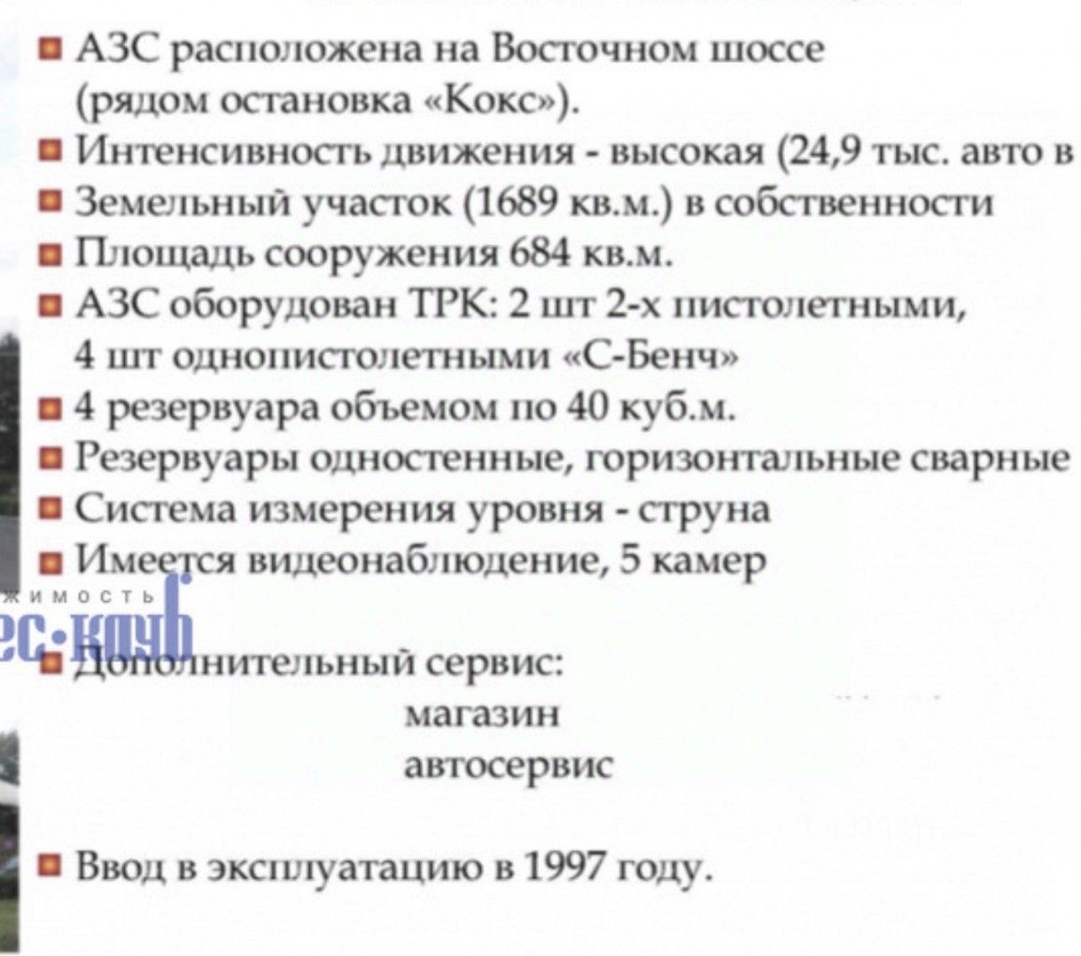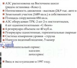 Арт. 128977901 Продам АЗС на Восточном шоссе рядом с остановкой Кокс-Евразинтенсивность движения 35000 в суткиземельный участок -17 сотокплощадь сооружений -700 м2АЗС оборудован ТРК: 2 шт 2-х пистолетными4 резервуара по 40 кубовоещервуары одностеннве, горизонтальные сварныесистема измерения уровня видеонаблюдение магазин автосервис есть возможность подключения к Магистральному Газу и возможность размещения под Газовую заправку