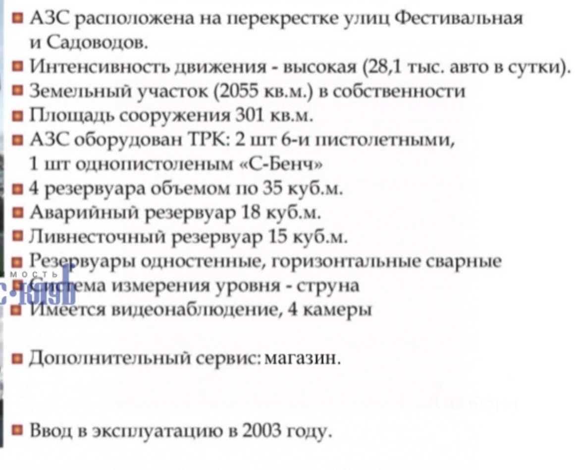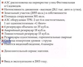 Арт. 128977311 Продам АЗС на Фестивальной и Садоводов, интенсивность движения 40000 автомобилей в суткиземельный участок 20 соток в собственности АЗС 300 м2АЗС оборудован ТРК: 2 шт 6 -и пистолетами1 шт однопистолетным ''С-Бенч''4 резервуара по 35 кубоваварийный резервуар 18 кубов лианесточный резервуар 15 кубов магазинсистема измерения уровня-струнавидеонаблюдение Возможно установка Газовой оборудования для заправки Газом