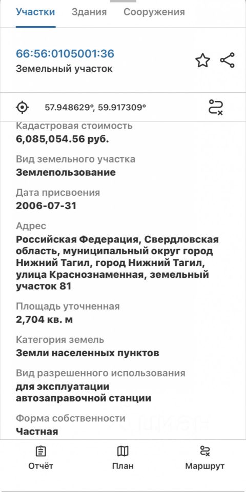 Данные получены с сайта ГИС Торги.- Нежилое здание (объект в стадии разрушения), кадастровый номер 66:56:0208006:18266, площадью 983,8 кв. метра. Год постройки 1971. Сети инженерно-технического здания отключены. Обременений нет. Адрес: г. Нижний Тагил, улица Балакинская, 61. - Земельный участок, кадастровый номер 66:56:0208006:18253, площадью 2945 кв. метров. Категория земель земли населенных пунктов. Разрешенное использование коммунальное обслуживание, деловое управление. Адрес: г. Нижний Тагил, улица Балакинская, з/у 61/4