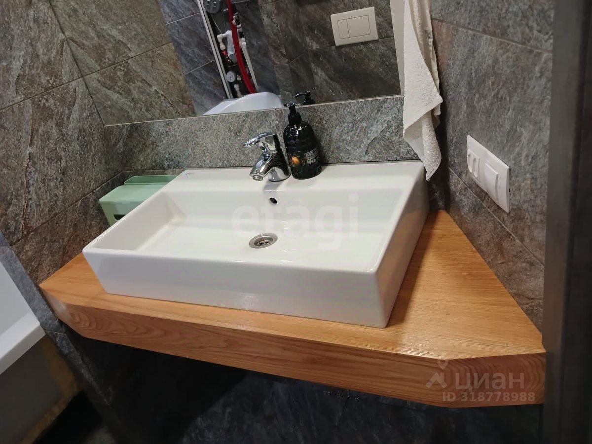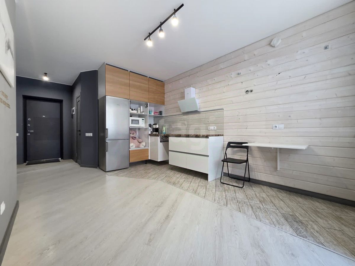 Кухня оборудована встроенной мебелью из натурального шпона и акрила с фурнитурой Blum, а также техникой, которая остается в квартире: холодильник, плита, вытяжка и микроволновка. Пол в кухонной зоне с подогревом, выложен кафелем. В спальне — вместительный шкаф-купе и диван-кровать. Санузел оснащен инсталляцией, врезной столешницей с большой раковиной, пеналом для хранения и местом под стиральную машину.